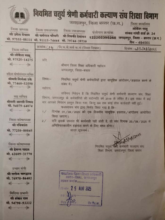 संघ ने प्रशासन को समय-सीमा प्रदान करते हुए कहा है, कि यदि इस अवधि में पदोन्नति कार्यवाही प्रारंभ नहीं होती है, तो आंदोलनात्मक रूप अपनाया जाएगा, जिसकी सम्पूर्ण जिम्मेदारी जिला प्रशासन की होगी। प्रशासन के ध्यान आकर्षण के लिए संघ के द्वारा 1 सितंबर को सामूहिक अवकाश लेकर एक दिवसीय धरना का फैसला किया है। संघ ने अपील की है कि कर्मचारियों के हित एवं सेवाओं की निरंतरता को ध्यान में रखते हुए तत्काल प्रभाव से पदोन्नति प्रक्रिया प्रारंभ की जाए ताकि लम्बे समय से प्रतीक्षारत कर्मचारियों को न्याय मिल सके।