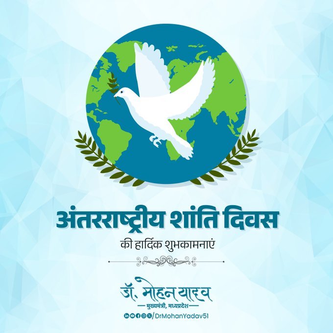 मुख्यमंत्री डाॅ. यादव ने साेशल मीडिया एक्स पर अपने शुभकामना संदेश में कहा आप सभी को ‘अंतरराष्ट्रीय शांति दिवस’ की हार्दिक शुभकामनाएं। हम सभी को गर्व है कि युगों से शांति ही भारत का मूल चरित्र है। आइए, ‘वसुधैव कुटुम्बकम्’ की भावना के साथ इसे आगे बढ़ाते हुए ‘Act Now for a Peaceful World’ थीम के लक्ष्यों को पूरा करने हेतु संकल्पित हों।