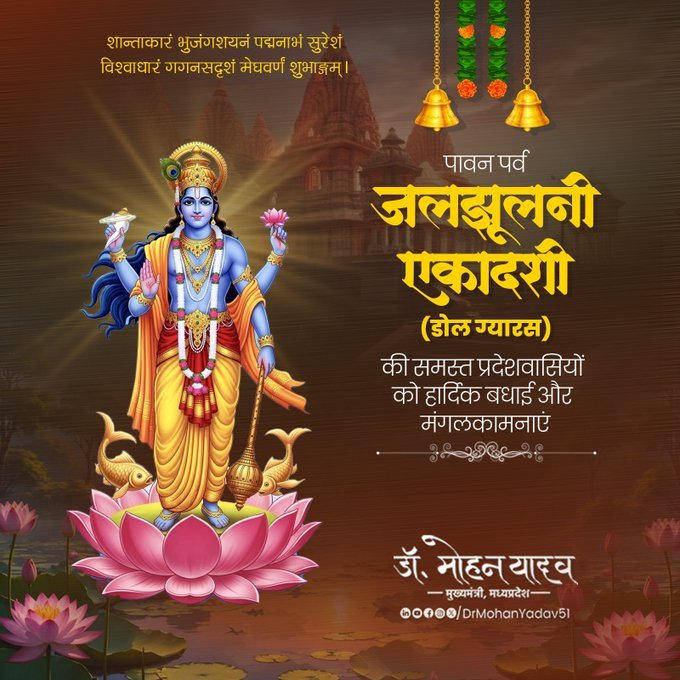 मुख्यमंत्री डाॅ. यादव ने साेशल मीडिया एक्स पर पाेस्ट करते हुए लिखा, मोक्षदायिनी जलझूलनी एकादशी (डोल ग्यारस) पर्व की सभी प्रदेशवासियों को हार्दिक बधाई। भगवान श्रीहरि विष्णु से प्रार्थना है कि सभी पर अनवरत सुख-समृद्धि की वर्षा करते रहें, सभी के जीवन में आरोग्यता बनी रहे; यही मंगलकामना है।