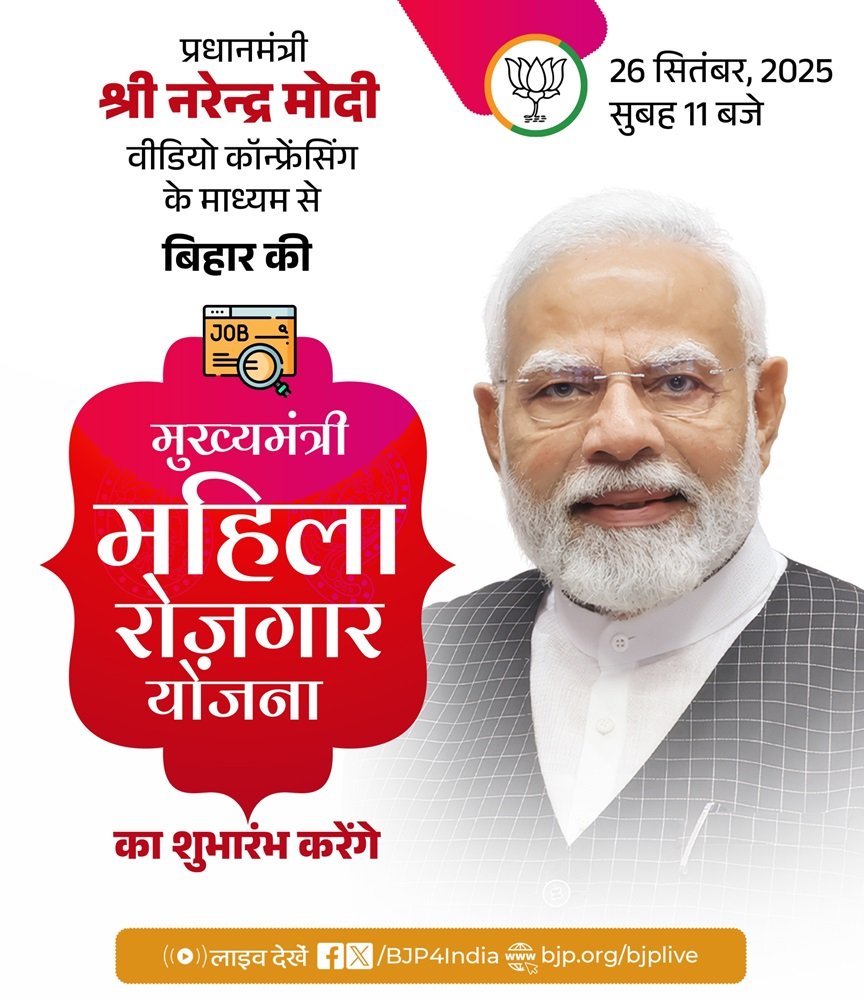 नई दिल्ली, 26 सितंबर । प्रधानमंत्री नरेन्द्र मोदी आज सुबह 11 बजे वीडियो कॉन्फ्रेंसिंग के माध्यम से बिहार की मुख्यमंत्री महिला रोजगार योजना का श्रीगणेश करेंगे। इस दौरान प्रधानमंत्री बिहार की 75 लाख महिलाओं के बैंक खातों में सीधे 10-10 हजार रुपये, यानी कुल 7,500 करोड़ रुपये हस्तांतरित करेंगे। बिहार सरकार की इस योजना का उद्देश्य महिलाओं को आत्मनिर्भर बनाना और स्व-रोज़गार एवं आजीविका के अवसरों के माध्यम से महिला सशक्तिकरण को बढ़ावा देना है। यह जानकारी आधिकारिक विज्ञप्ति में दी गई है।
