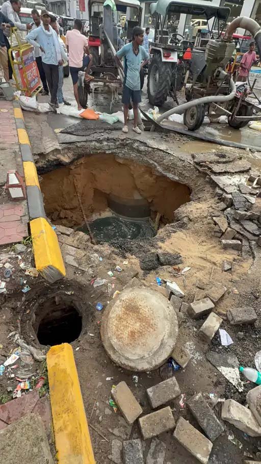 दरअसल सबसे व्यस्ततम मिर्जा इस्माईल रोड के गवर्मेंट हॉस्टल चौराहे पर गुरुवार को बारिश के बाद सड़क में 15 फीट गहरा और 12 फीट चौड़ा गड्ढा हो गया, इसमें सीवरेत का पानी भर गया। अचानक बने गड्ढे के बाद पुलिस प्रशासन ने बैरिकेडिंग लगाकर रास्ता बंद कर दिया। वहीं हेरिटेज निगम की टीम ने गड्ढा खाली कर सड़क को फिर से ठीक करने की कार्रवाई शुरू कर दी है। इसकी वजह से मुख्य सड़क पर जाम के हालात बन गए हैं। शाम का वक्त होने की वजह से एमआई रोड पर ट्रैफिक रेंग- रेंग कर चला। सड़क धंसने के पीछे सीवर लाइन में लीकेज की बात कहीं जा रही है। कई घंटे गुजर जाने के बाद निगम की टीम इस गड्ढे में भरे पानी को निकाल नहीं पाई थी।