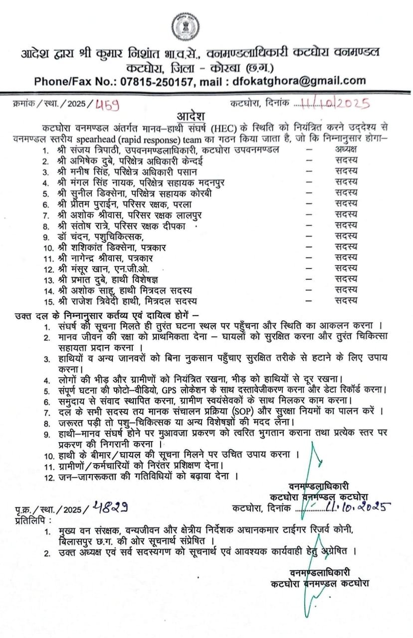 वनमंडलाधिकारी कटघोरा कुमार निशांत ने आदेश में कहा है कि यह दल किसी भी संघर्ष की सूचना पर तुरंत मौके पर पहुंचेगा, घायलों को सुरक्षित करेगा और हाथियों को बिना नुकसान पहुंचाए सुरक्षित दिशा में मोड़ेगा। साथ ही, प्रत्येक घटना की फोटो-वीडियो व जीपीएस लोकेशन सहित रिपोर्ट तैयार की जाएगी और मुआवजा प्रकरणों को प्राथमिकता से निपटाया जाएगा। दल के सदस्यों को समुदाय से संवाद, भीड़ नियंत्रण, जनजागरूकता और ग्रामीणों को प्रशिक्षण देने का दायित्व भी सौंपा गया है।