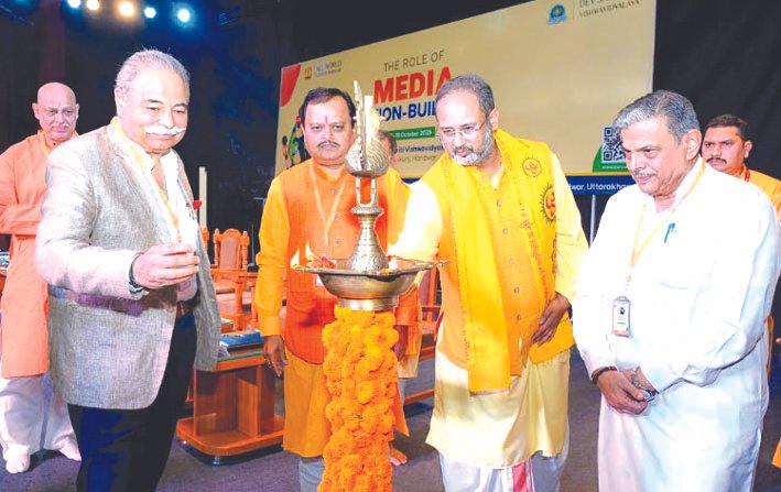 सरकार्यवाह दत्तात्रेय होसबोले यहां स्थानीय देव संस्कृति विश्वविद्यालय में शुक्रवार को राष्ट्र निर्माण में आयाेजित मीडिया की भूमिका विषय पर राष्ट्रीय सम्मेलन काे संबाेधित कर रहे थे। इससे पहले राष्ट्रीय स्वयंसेवक के सरकार्यवाह दत्तात्रेय होसबोले, देसंविवि के कुलपति शरद पारधी, प्रतिकुलपति डॉ चिन्मय पण्ड्या, पूर्व सांसद तरुण विजय ने संयुक्त रूप से सामूहिक दीप प्रज्ज्वलन कर इस सम्मेलन का स्वागत किया। दिनभर चले इस सम्मेलन में कुल पांच सत्र हुए, जिनमें वक्ताओं ने मीडिया को भारत को विकसित बनाने में योगदान देने के लिए आह्वान किया।