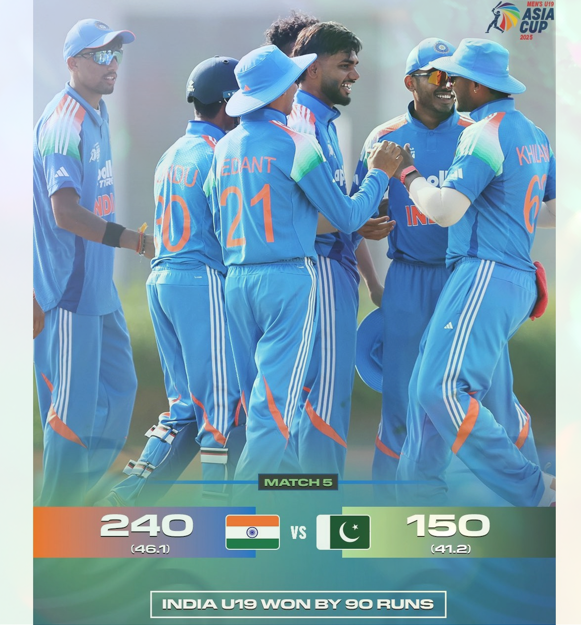 दुबई के आईसीसी अकादमी मैदान में खेले गए मैच में पहले बल्लेबाजी करते हुए भारतीय टीम ने आरोन जॉर्ज के 85 रन और कनिष्क चौहान के 46 रनों की पारी की बदौलत 46.1 ओवर में 240 रन बनाए। इसके जवाब में पाकिस्तान की टीम 41.2 ओवर में 150 रन पर ढेर हो गई। पाकिस्तान के लिए हुजैफा एहसान ने सबसे ज्यादा 70 रन बनाए। भारत की ओर से दीपेश देवेंद्रन और कनिष्क चौहान ने तीन-तीन विकेट लिए। बारिश की वजह से यह मैच 49-49 ओवर का खेला गया।