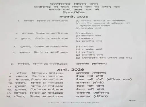इस सत्र में नए विधेयक भी पेश किए जा सकते हैं। साथ ही जरूरत पड़ने पर अनुपूरक बजट पर भी विचार किया जा सकता है। सत्र के दौरान 2, 3, 5 और 6 मार्च को अवकाश रहेगा और 4 मार्च को होली की छुट्टी रहेगी।