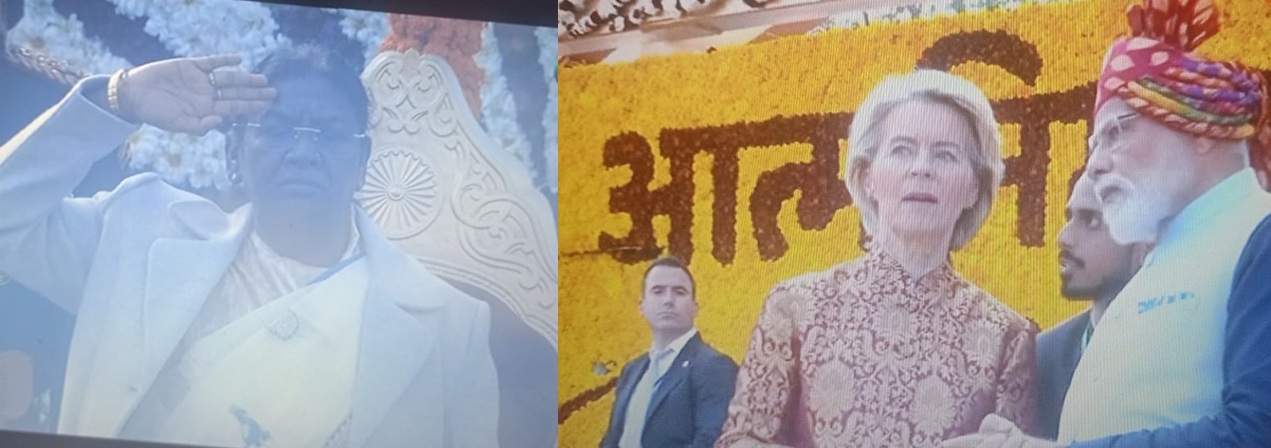 राष्ट्रपति द्रौपदी मुर्मु, यूरोपीय परिषद के अध्यक्ष और यूरोपीय आयोग की अध्यक्ष के आगमन के साथ राष्ट्रीय ध्वज फहराया गया। इसके बाद राष्ट्रगान हुआ और 105 एमएम लाइट फील्ड गन से 21 तोपों की सलामी दी गई। ‘विविधता में एकता’ थीम पर 100 सांस्कृतिक कलाकार परेड की शुरुआत की। 129 हेलीकॉप्टर यूनिट के चार एमआई-17 1वी हेलीकॉप्टर ध्वज फॉर्मेशन में फूलों की पंखुड़ियों की की गई। राष्ट्रीय ध्वज को लेकर, हेलीकॉप्टरों के इस प्रदर्शन का नेतृत्व ग्रुप कैप्टन आलोक अहलावत ने किया। राष्ट्रपति के सलामी लेने के साथ परेड शुरू हुई। दिल्ली क्षेत्र के जनरल ऑफिसर कमांडिंग परेड कमांडर लेफ्टिनेंट जनरल भवनीश कुमार परेड की कमान संभाली हुई है। मुख्यालय दिल्ली क्षेत्र के चीफ ऑफ स्टाफ मेजर जनरल नवराज ढिल्लों परेड के सेकंड-इन-कमांड हैं। वो तीसरी पीढ़ी के सैन्य अधिकारी हैं।