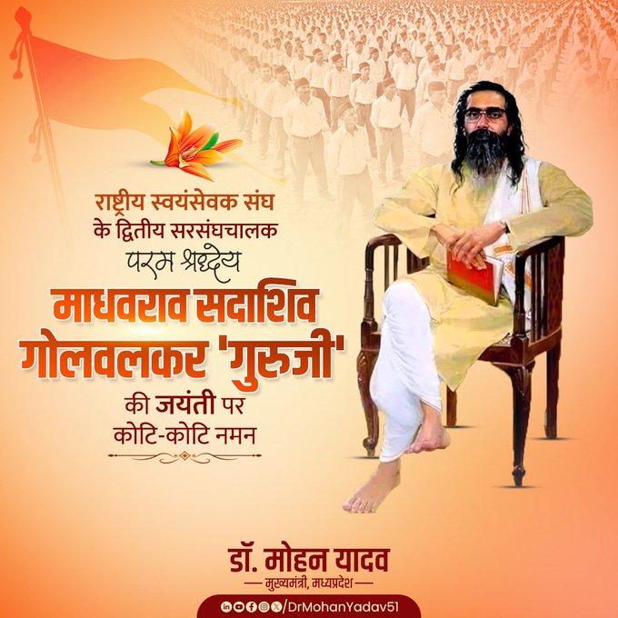 मुख्यमंत्री डाॅ. यादव ने माधवराव सदाशिव गोलवलकर काे जयंती पर नमन करते हुए कहा- राष्ट्रीय स्वयंसेवक संघ के द्वितीय सरसंघचालक, परम श्रद्धेय माधवराव सदाशिव गोलवलकर ‘गुरुजी’ की जयंती पर सादर नमन करता हूं। राष्ट्र के प्रति आपका प्रखर चिंतन, ओजस्वी विचार एवं समर्पित जीवन हम सभी को प्रतिक्षण राष्ट्र सेवा हेतु प्रेरित करता रहेगा।
