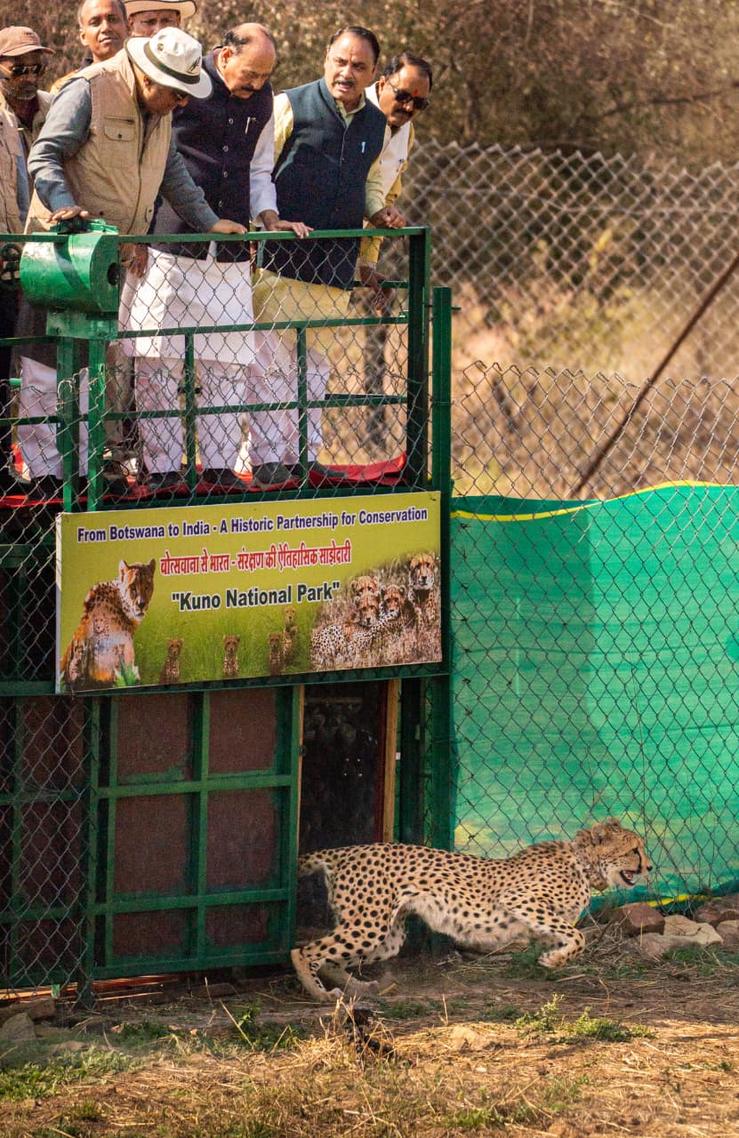 भारत में चीतों की पुर्नबसाहट के लिए तीन वर्ष पूर्व शुरू हुए चीता प्रोजेक्ट के तहत बोत्सवाना से लाये गये 9 चीते को शनिवार को आयुसेना के तीन विशेष हेलीकॉप्टरों से सुबह 9.30 कूनो राष्ट्रीय उद्यान पहुंचे। उन्होंने बोत्सवाना से ग्वालियर तक विशेष विमान से लगाया गया, इसके बाद वायुसेना के तीन हैलीकॉप्टर से ग्वालियर एयरपोर्ट से इन चीतों को कूनो में एयरलिफ्ट किया गया। केन्द्रीय वन एवं पर्यावरण मंत्री भूपेन्द्र यादव द्वारा बोत्सवाना से आये 9 चीतो में से तीन चीतो को प्रतीकात्मक रूप से क्वांरटीन के लिए पालपुर-मेघपुरा पूर्व बीट में बनाये गये बाडो में रिलीज किया गया।