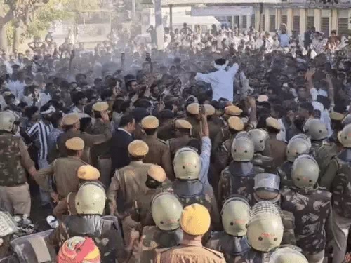 जालोर, 10 फ़रवरी । जिले के आहोर कस्बे में युवक की संदिग्ध मौत के मामले को लेकर पिछले तीन दिनों से जारी धरना-प्रदर्शन मंगलवार को उग्र हो गया। हालात बिगड़ने पर पुलिस को लाठीचार्ज करना पड़ा। इस दौरान भारत आदिवासी पार्टी (बाप) के जिलाध्यक्ष छगन लाल मीणा को पुलिस ने हिरासत में ले लिया। लाठीचार्ज में छगन मीणा के सिर में चोट भी आई है। मौके पर एसपी शैलेंद्र सिंह इंदोलिया सहित वरिष्ठ अधिकारी पहुंचे।