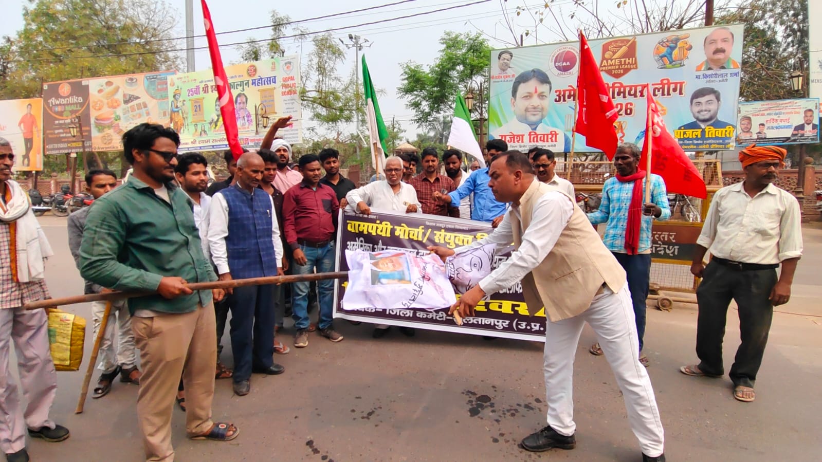 सुलतानपुर, 10 मार्च । उत्तर प्रदेश के जिला सुल्तानपुर में संयुक्त किसान मोर्चा ने मंगलवार को कलेक्ट्रेट परिसर में प्रदर्शन किया। इस दौरान कार्यकर्ताओं ने अमेरिकी राष्ट्रपति डोनाल्ड ट्रंप और इजरायली प्रधानमंत्री बेंजामिन नेतन्याहू का प्रतीकात्मक पुतला दहन किया। संयुक्त किसान मोर्चा के जिलाध्यक्ष शारदा प्रसाद पांडेय ने बताया कि यह कार्यक्रम राष्ट्रीय आह्वान पर आयोजित किया गया था।