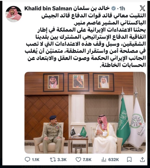 तुर्किए की समाचार एजेंसी अनादोलु ने सऊदी अरब के रक्षा मंत्री खालिद बिन सलमान के हवाले से शुक्रवार को बताया कि उन्होंने पाकिस्तानी सेना प्रमुख से मुलाकात कर क्षेत्रीय सुरक्षा हालात और सऊदी अरब पर हुए ईरानी हमलों पर चर्चा की।