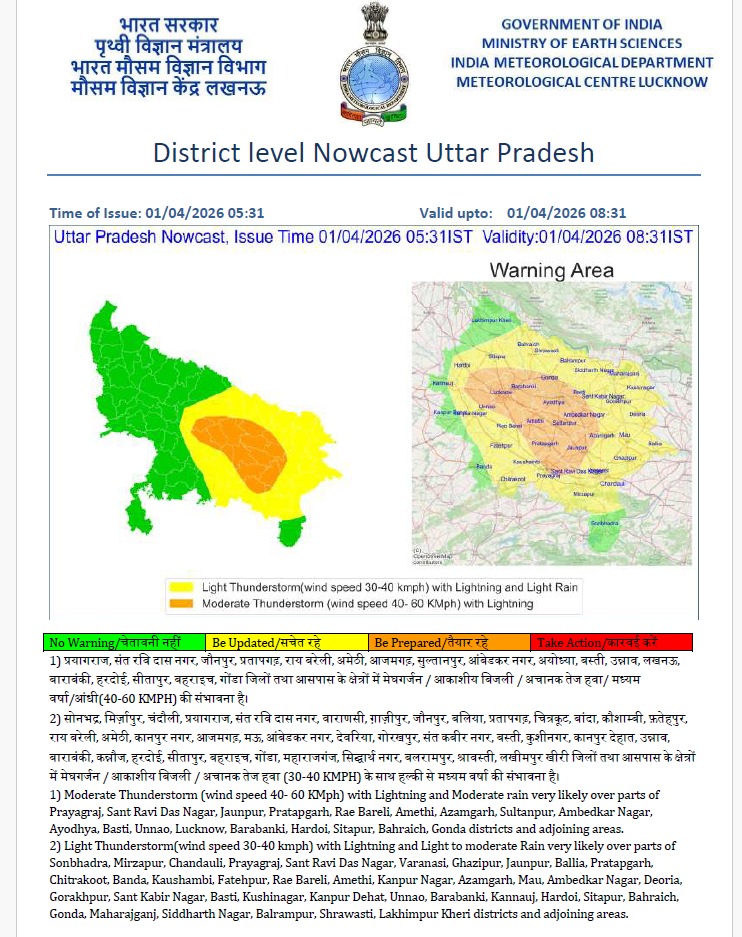 अलर्ट के दायरे में अंबेडकरनगर, अमेठी, अयोध्या, आजमगढ़, बहराईच, बाराबंकी, बस्ती, भदोही, गोंडा, हरदोई, जौनपुर, लखनऊ, प्रतापगढ़, प्रयागराज, रायबरेली, सीतापुर, सुल्तानपुर और उन्नाव जनपद शामिल हैं। इन क्षेत्रों में 40 से 60 किलोमीटर प्रति घंटे की रफ्तार से तेज हवाएं चलने की संभावना जताई गई है।